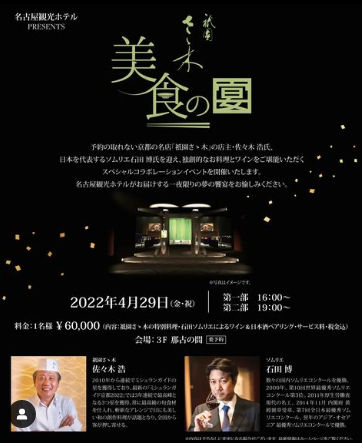 2022年4月29日(金) 第1部16:00、第2部19:00 料金:60,000円(税サ込) 内容:祇園さゝ木の特別料理・ 石田ソムリエによるワイン&日本酒ペアリング