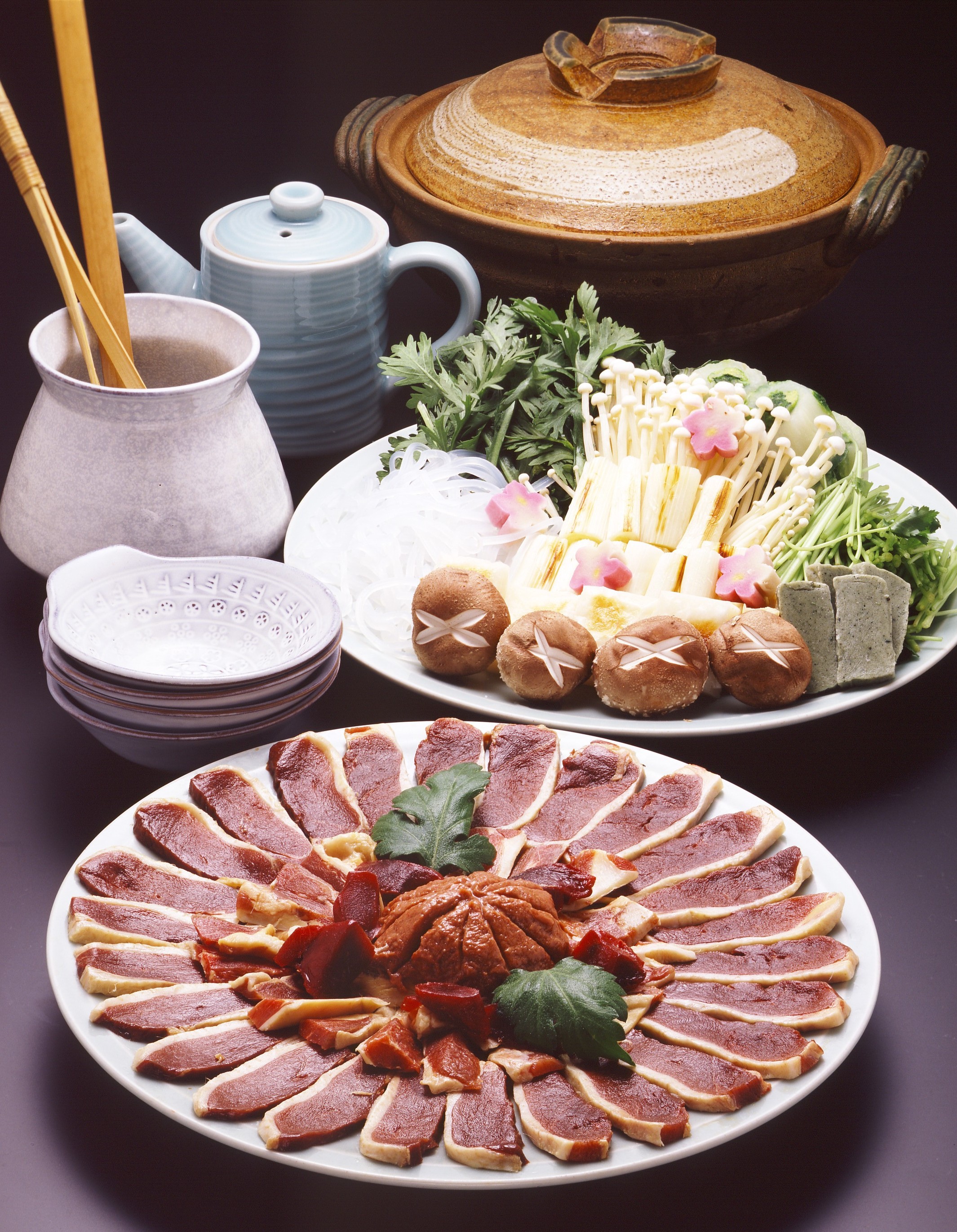 丹波産の野生のイノシシを白味噌仕立てのだしで煮て、旬の冬野菜とともにお召上がりいただく「ぼたん鍋」、新潟産の本鴨を鰹節と昆布のきいた旨だしでお召上がりいただく「鴨鍋」。