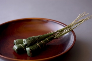 小豆こしあんを道明寺で包んだお菓子を竹皮で俵の形に模しました。