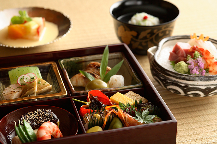 昼は「洛中弁当」5,000円~(平日のみ)のほか、オーセンティックな京会席に6種の自家製デザートが付く「昼のミニ会席」5,000円~。昼夜の「会席」15,000円~では、旬の素材を用いた料理の数々とともに、名物のふかひれゴマ豆腐鍋がいただける。ワイン好きなら「ワイン献立」25,000円~はいかが。ワインに合う和食とともに、シニアソムリエの資格を持つご主人が常時50種類から選ぶ極上のワインを堪能できる。