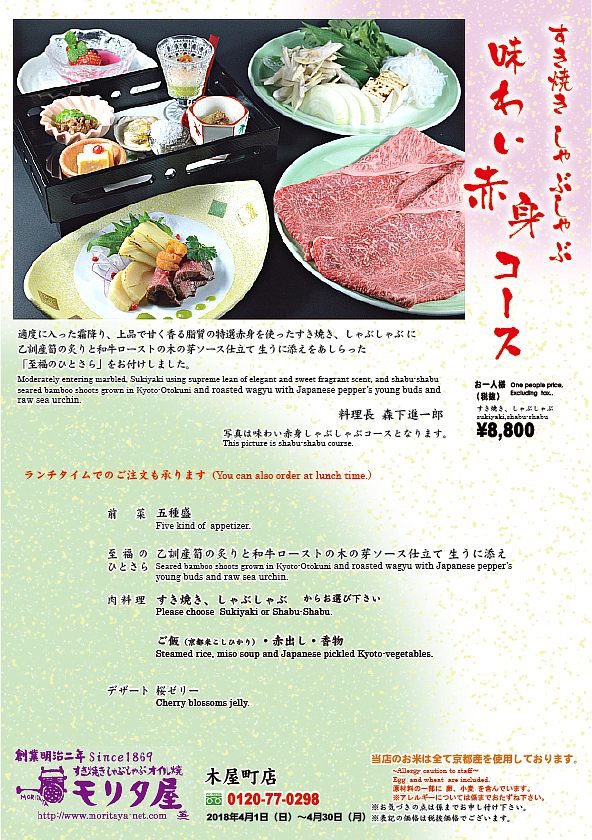 春の味覚、京都産新筍と共にモリタ屋自慢の特選黒毛和牛のヒレ、ロースの2つの味をすき焼きでお召し上がりいただける期間限定の特別コースです。