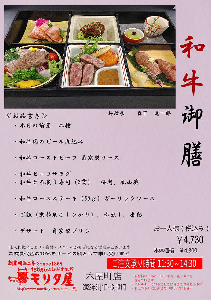3月 1日 ~ 3月31日 ランチタイムのみ 黒毛和牛や旬の食材を贅沢に使用しお弁当スタイルの御膳に仕上げました。