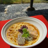 900坪ある敷地内には、数寄屋風の純日本建築と日本庭園があり、食事をしながら春の梅、秋の紅葉、そして苔の庭、竹林といった四季折々の風景を楽しめる。辺り一帯には尺八の音色が響き渡り、それもまた風情がある。